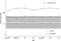 Erythropoietin (EPO), hemoglobin (HGB) and hematocrit (HCT) levels over the course of several visits for patient No. 3, starting from first presentation at NIH, before and after surgeries (prior OP1, after OP1 and prior OP2) and during intermediate follow-up visits (FU) before the second surgery at the NIH. Respective upper and lower reference intervals are indicated for EPO, HGB and HCT in grey, light grey and dark grey, respectively. EPO levels did not normalize after surgeries, strongly refuting EPO production by tumor tissue.