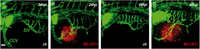 MTC-grafted cells stimulate angiogenesis in zebrafish embryos. Representative confocal microscopic images of Tg(fli1:EGFP)y1 zebrafish embryos implanted with red fluorescence-stained MZ-CRC1 (B and D) cells. 24 (A and B) and 48 (C and D) hours after injection (hpi), larvae were embedded in low-melting agarose, and the yolk region was observed by confocal microscopy. In comparison to control larvae (A and B), MTC-grafted larvae showed endothelial structures (green) that sprout from the subintestinal vein (SIV) plexus and the common cardinal vein (CCV) (B and D) and progressively form new vessels. All images are oriented so that rostral is to the left and dorsal is at the top. Scale bar, 50 μm.