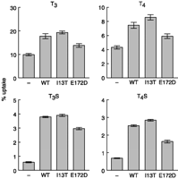[125I]T3, [125I]T4, [125I]T3S, and [125I]T4S uptake by COS1 cells transfected with empty vector, wild-type OATP1A2, OATP1A2-Ile13Thr, or OATP1A2-Glu172Asp. Cells were co-transfected with μ-crystallin (Vie et al. 1997). Cells were incubated for 30 min at 37 °C with 1 nM [125I]T3, T4, T3S, or T4S. Data are expressed as percentage uptake of added radioactivity. Results are the means±s.e.m. of three experiments. *P<0.05 for OATP1A2-Ile13Thr or OATP1A2-Glu172Asp versus wild-type OATP1A2.