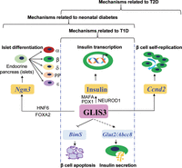 Current understanding of the molecular actions of GLIS3 in diabetes. This figure summarizes the pathways by which ablation, loss-of-function mutations or functional impairment of GLIS3 cause neonatal diabetes, as well as common T1D and T2D. See text for details. A full colour version of this figure is available at http://dx.doi.org/10.1530/JME-16-0232.